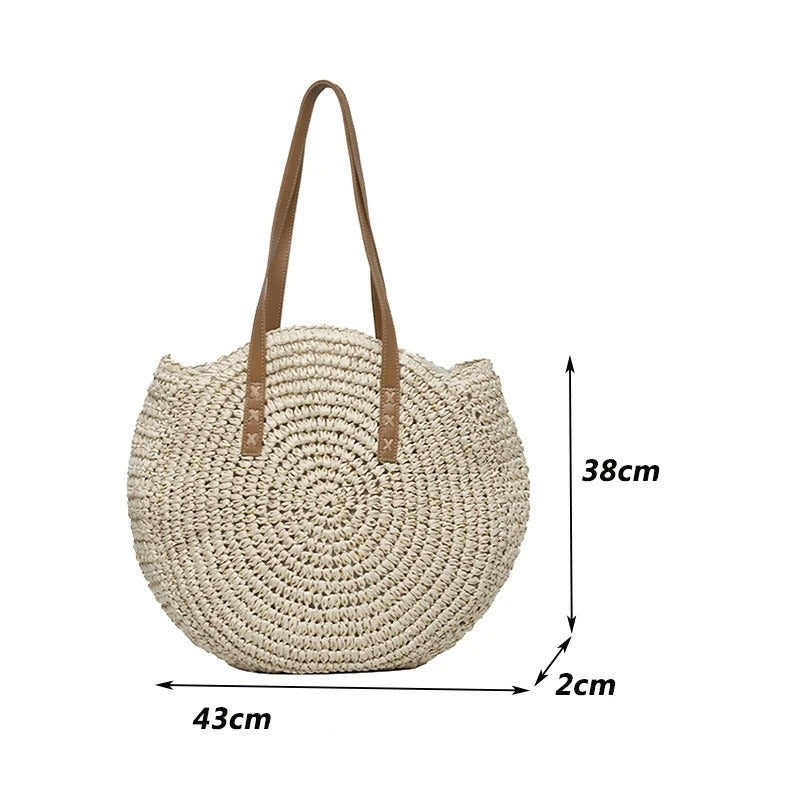 Rymlig och stilren rund stråväska med somrig känsla, perfekt för både stranden och stan. Designad för att rymma allt du behöver och samtidigt se riktigt snygg ut.